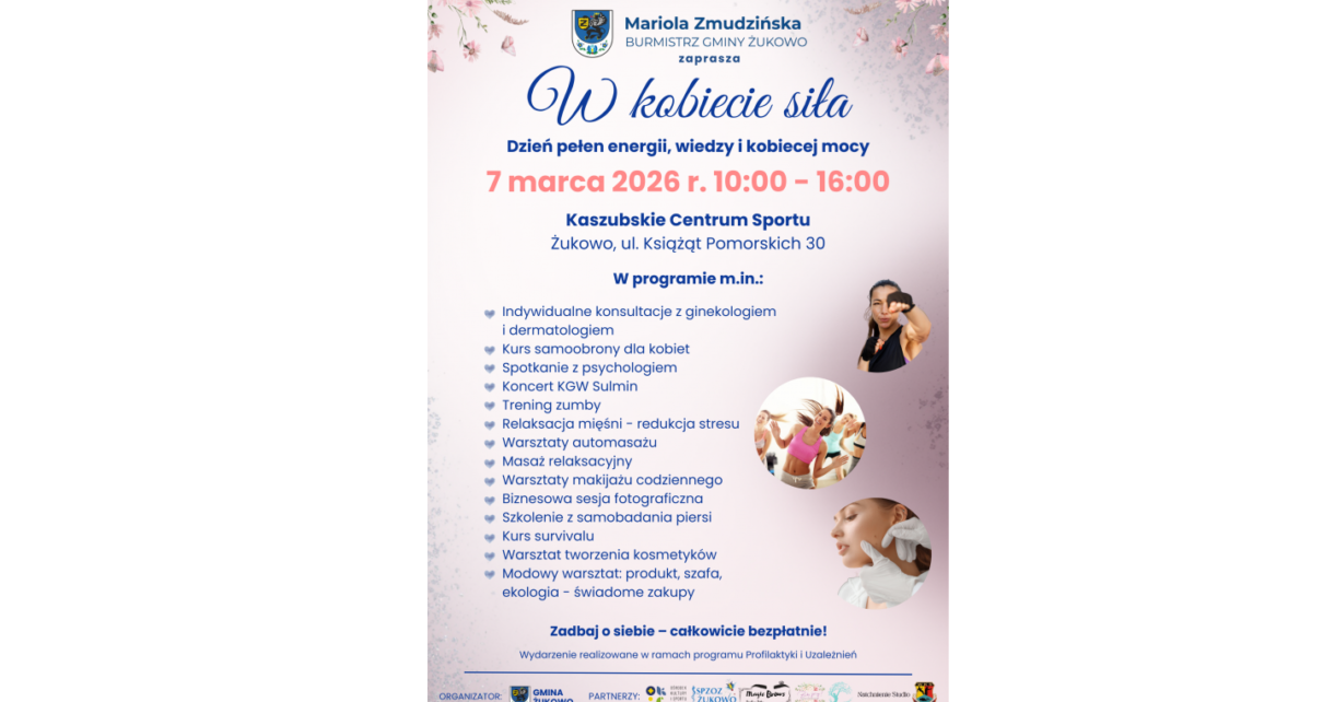 Chcą pokazać, że „W kobiecie siła” 7 marca w Kaszubskim Centrum Sportu w Żukowie odbędzie się wydarzenie pod hasłem „W kobiecie siła”. Odbędą się tu zajęcia poświęcone zdrowiu, rozwojowi i dobremu samopoczuciu kobiet. Wydarzenie łączy profilaktykę zdrowotną, warsztaty, aktywność fizyczną oraz czas na relaks i inspirację. Wydarzenie rozpocznie się o godz. 10 i potrwa do […]