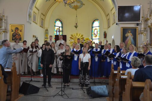 Uczestnicy koncertu usłyszeli m.in. „Fanfary na 100-lecie parafii” Pawła Krefta czy „Pieśń różańcowa” Eryka Boraka. W programie znalazły się także kompozycje Jerzego Stachurskiego do tekstów Lucyny Reiter-Szczygieł, Tomasza Fopkego i Eugeniusza Pryczkowskiego oraz utwór „Łąkowska Pani” z muzyką Agnieszki Łabuda-Wiatr.