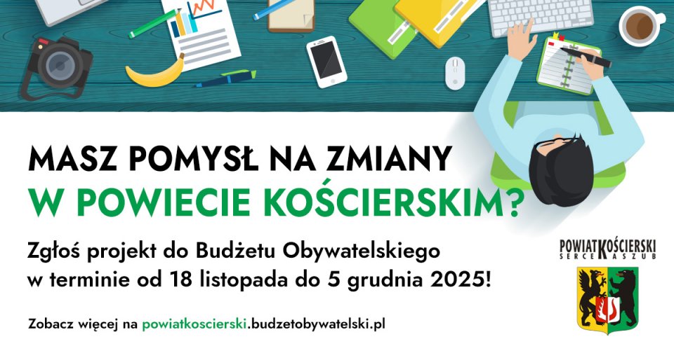 Masz realną szansę zrealizować własne pomysły oraz zmienić wizerunek Twojego otoczenia. To Twój wkład w rozwój powiatu! W procesie budżetu obywatelskiego może uczestniczyć każdy mieszkaniec Powiatu Kościerskiego. Możesz zagłosować na najlepsze Twoim zdaniem projekty lub zgłoś własny projekt i miej realny wpływ na rozwój Twojego powiatu.