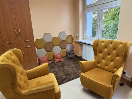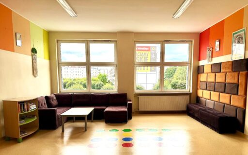 Dla uczniów przygotowano specjalne strefy relaksu, wyposażone w wygodne meble, takie jak kanapy, pufy, fotele i ławeczki, a ściany ozdobiono tapicerowanymi panelami, które sprzyjają wyciszeniu i poczuciu komfortu.